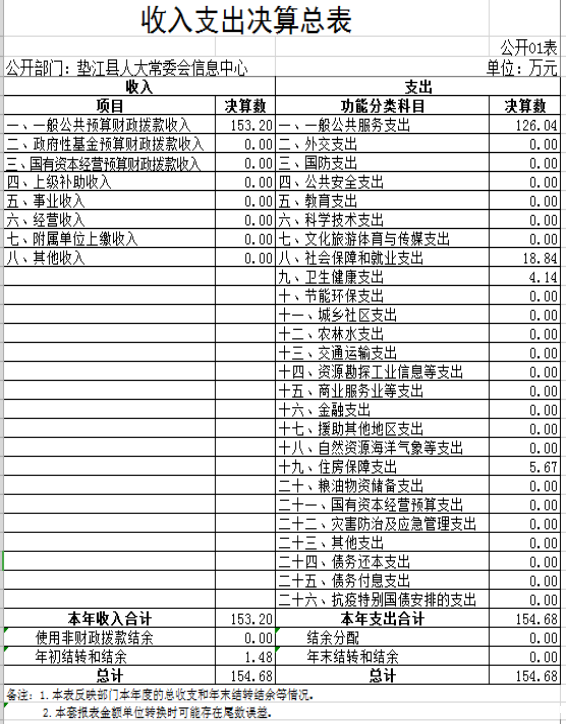 1.总体情况。2022年度收入总计154.68万元,支出总计154.68万元。收支较上年决算数增加154.68万元,增长0.0%,主要原因是新增2022年决算单位。