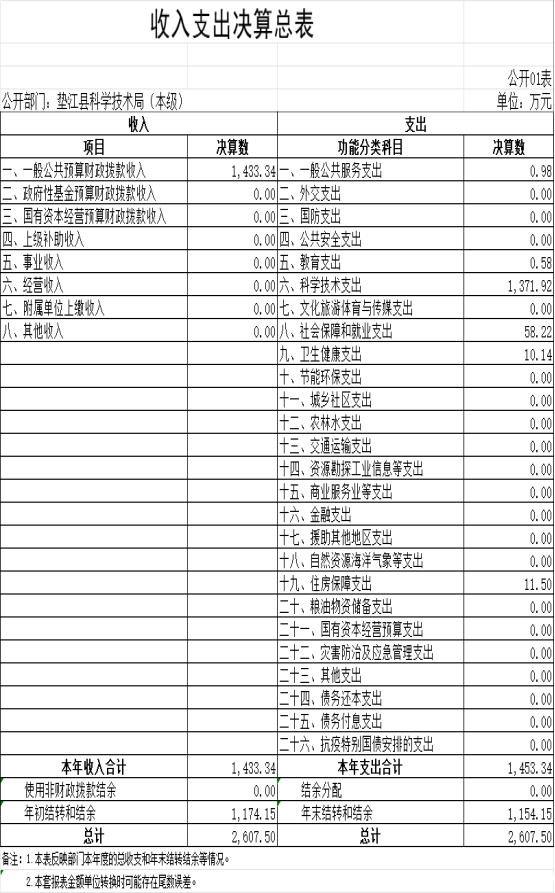 1.总体情况。2022年度收入总计2,607.5万元,支出总计2,607.5万元。收支较上年决算数减少6,123.46万元,下降70.1%,主要原因是财政资金紧张,统筹使用科技发展资金。