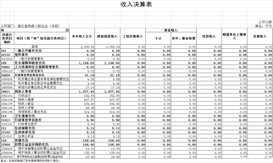 2.收入情况。2022年度收入合计1,292.29万元,较上年决算数减少150.14万元,下降10.4%,主要原因是上年度与总社合并决算,本年度单独核算并决算以及残疾人经费减少。其中:财政拨款收入1,292.29万元,占100.0%。此外,年初结转和结余15.76万元。