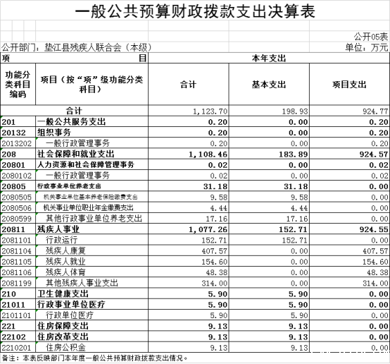 2.支出情况。2022年度一般公共预算财政拨款支出1,123.7万元,较上年决算数减少194.51万元,下降14.8%。主要原因是上年决算未与总社分开单独决算以及残疾人经费减少,支出减少。较年初预算数减少137.1万元,下降10.9%。主要原因是残疾人就业、康复等项目预算调减,相应预算减少。