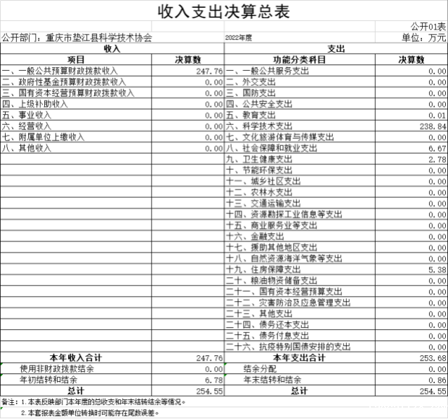 1.总体情况。2022年度收入总计254.55万元,支出总计254.55万元。收支较上年决算数增加21.62万元,增长9.3%,主要原因是人员经费支出增加、召开县科协第六次代表大会费用及加大科普经费投入。2022年度财政拨款收入总计247.76万元,年初财政拨款结转6.78万元,合计收入254.55万元。支出253.68万元,年末结转0.86万元。
