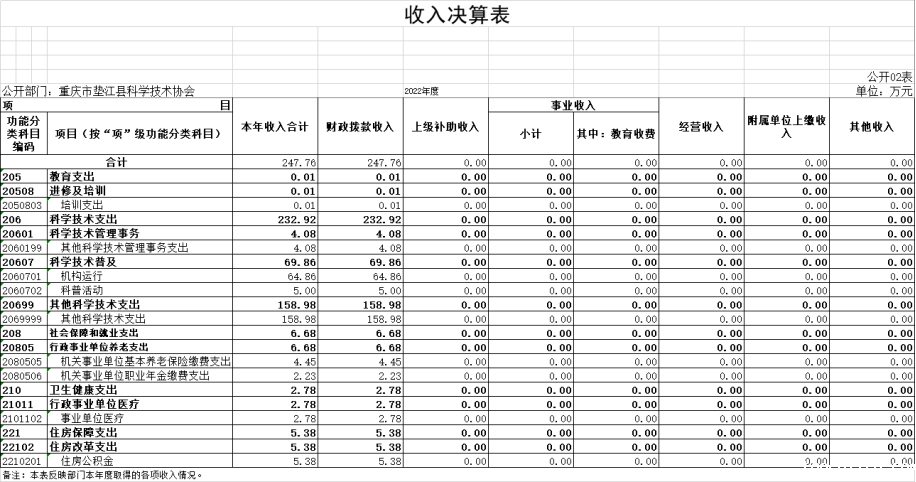 2.收入情况。2022年度收入合计247.76万元,较上年决算数增加15.71万元,增长6.8%,主要原因是人员经费增加及加大科普经费投入。其中:财政拨款收入247.76万元,占100%;事业收入0万元,占0.0%;经营收入0万元,占0.0%;其他收入0万元,占0.0%。此外,使用非财政拨款结余0万元,年初结转和结余6.78万元。