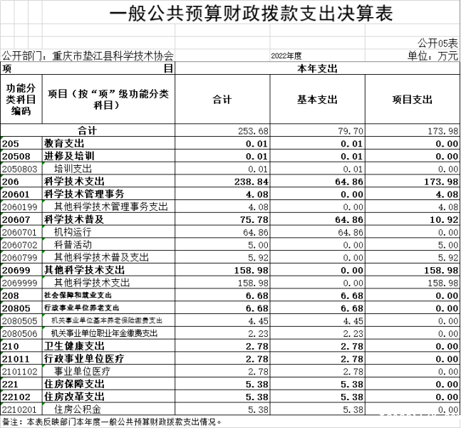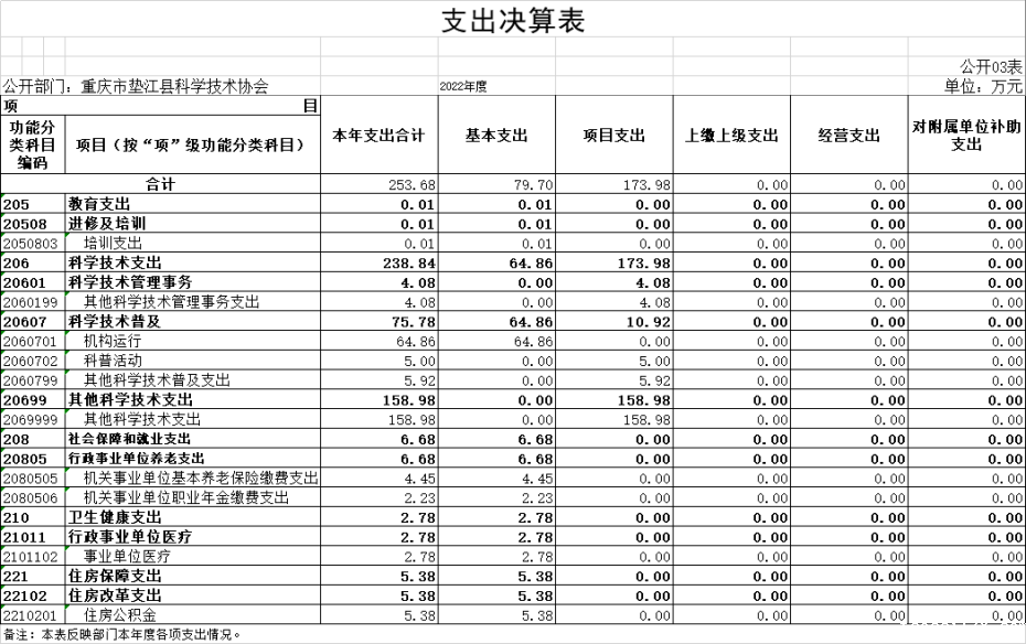3.支出情况。2022年度支出合计253.68万元,较上年决算增加21.62万元,增长9.3%,主要原因是人员经费增加、召开县科协第六次代表大会费用及加大科普经费投入。其中:基本支出79.7万元,占31.4%;项目支出173.98万元,占68.6%;经营支出0万元,占0.0%。此外,结余分配0万元。