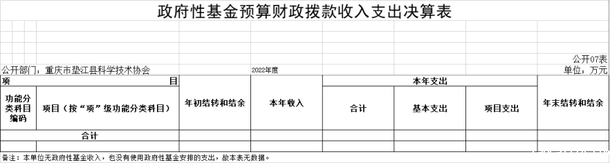 2022年度政府性基金预算财政拨款年初结转结余0万元,年末结转结余0万元。本年收入0万元,较上年决算数增加0万元,增长0.0%,主要原因是本部门2022年度无政府性基金预算财政拨款收支。本年支出0万元,较上年决算数增加0万元,增长0.0%,主要原因是本单位2022年度无政府性基金预算财政拨款收支。