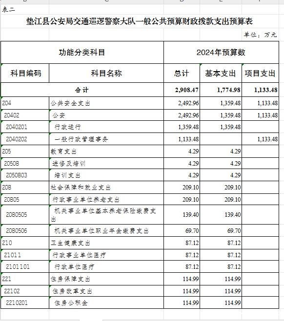 2. 垫江县公安局交通巡逻警察大队一般公共预算财政拨款支出预算表