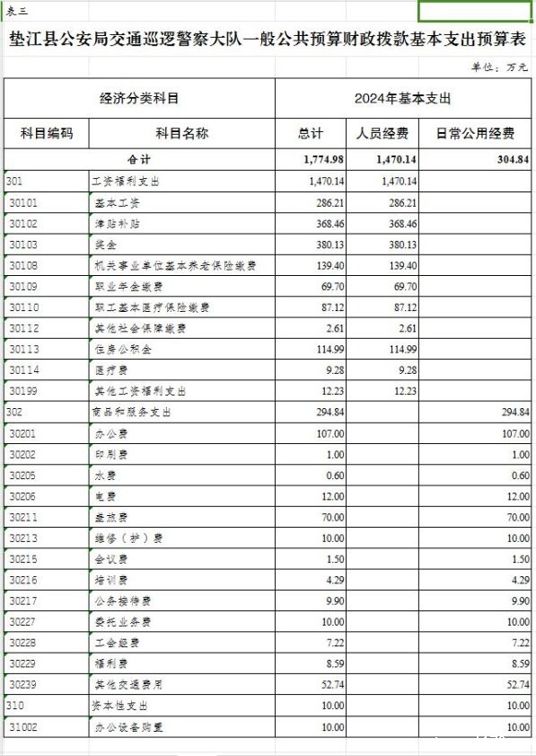 3. 垫江县公安局交通巡逻警察大队一般公共预算财政拨款基本支出预算表