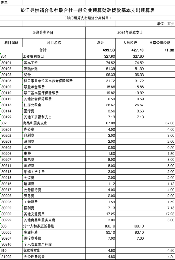 3.垫江县供销合作社联合社一般公共预算财政拨款基本支出预算表