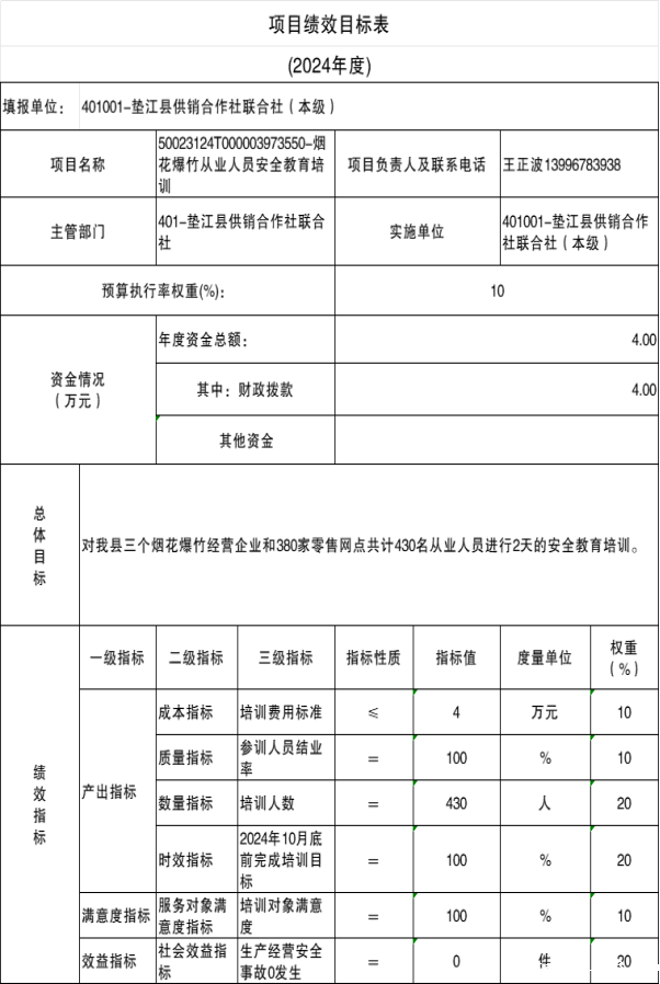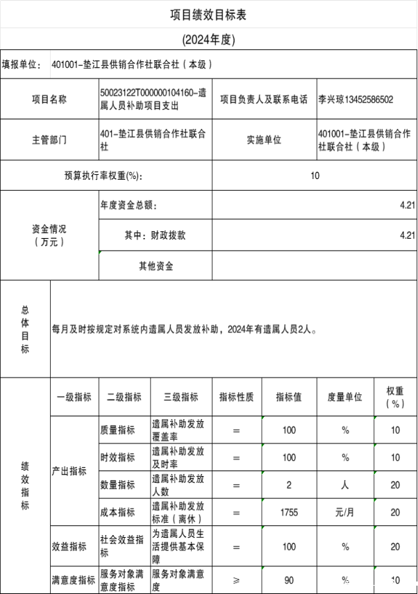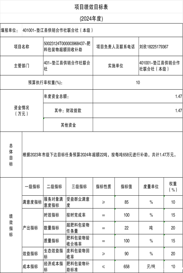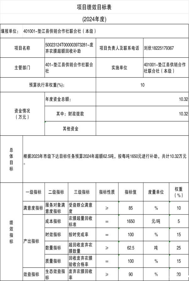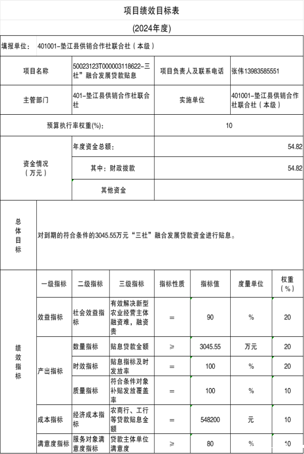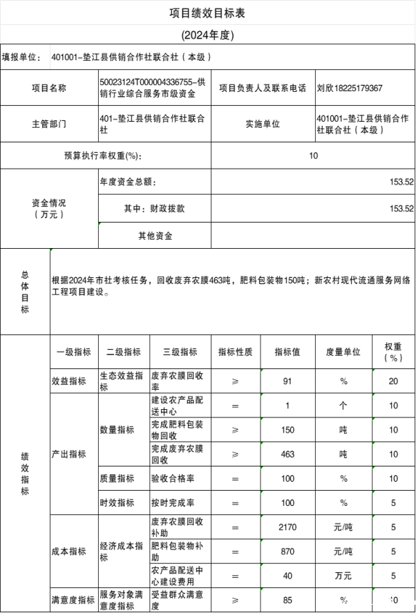 10.垫江县供销合作社联合社2024年部门整体绩效目标表
