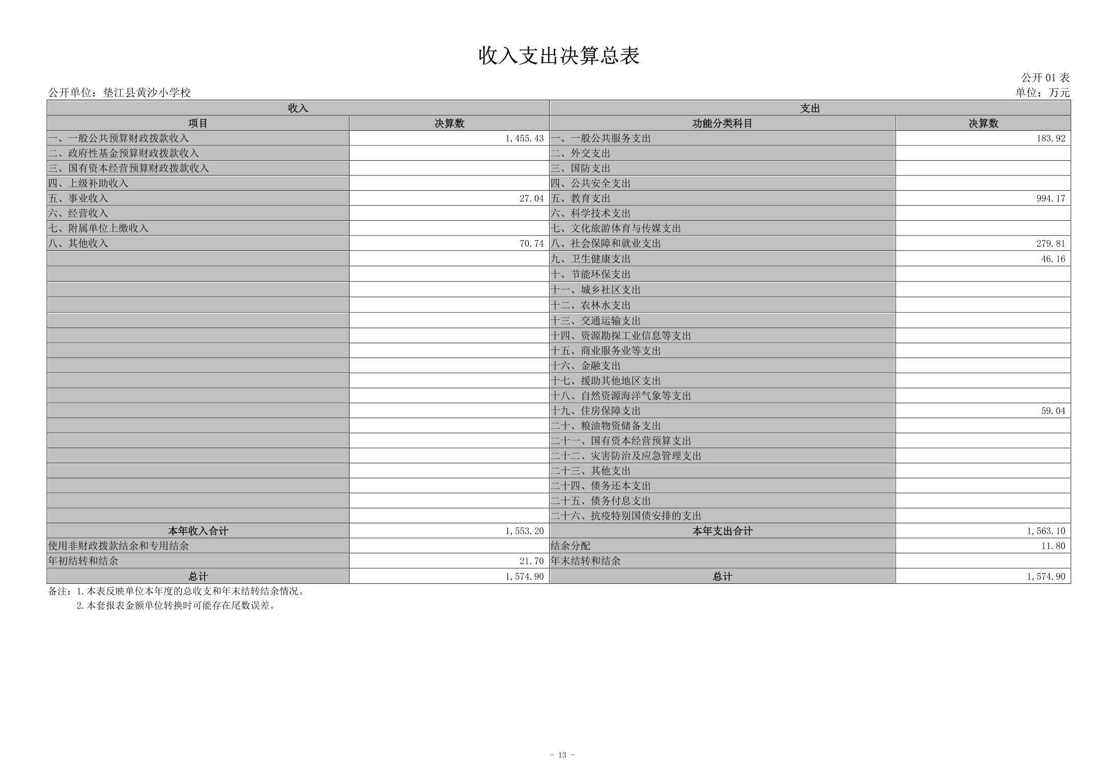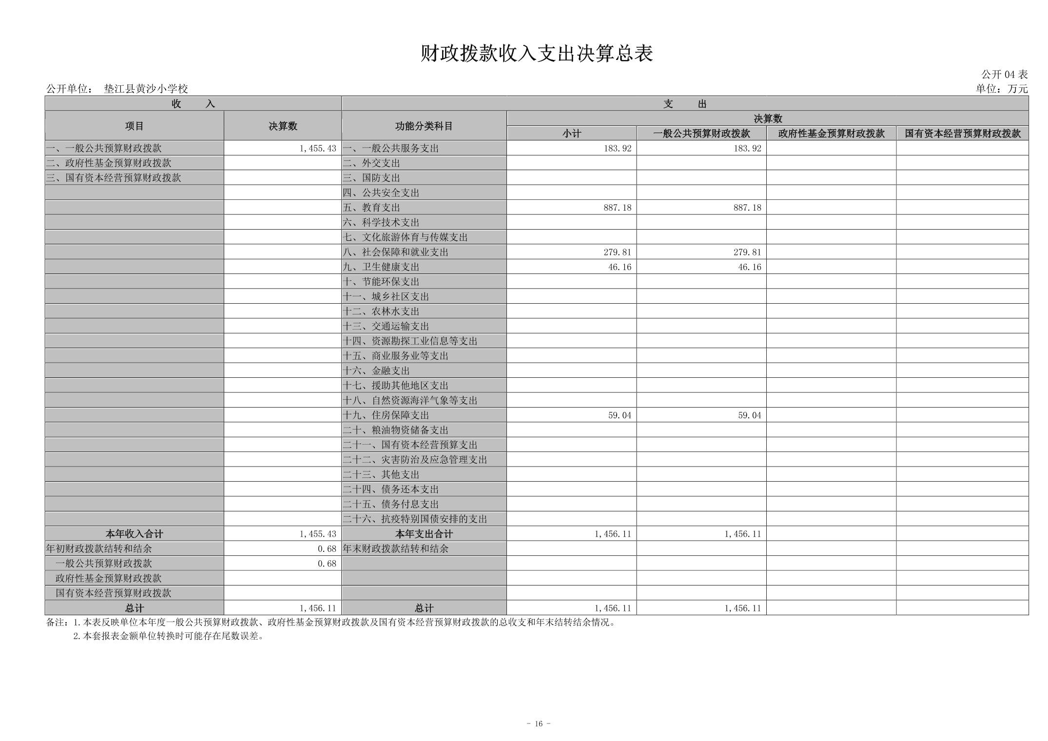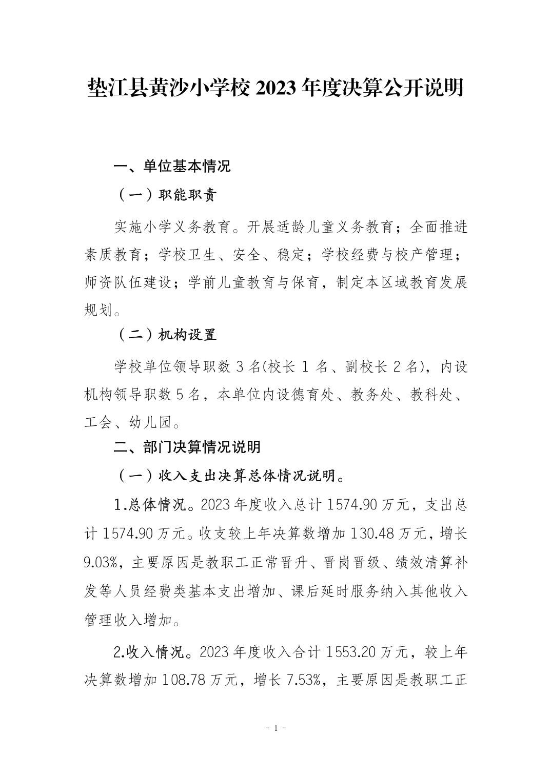 垫江县黄沙小学校2023年决算公开