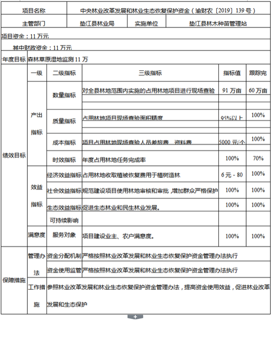 根据预算绩效管理要求,本部门对1个项目开展了绩效自评,其中,以填报目标自评表形式开展自评1项,涉及资金11万元,从评价情况来看,市财政下达森林草原湿地监测11万元。经统计,森林草原湿地监测11万元,执行率100.0.0%,己支付11万元,支付率为100.0.0%。主要用于松材线虫除治。