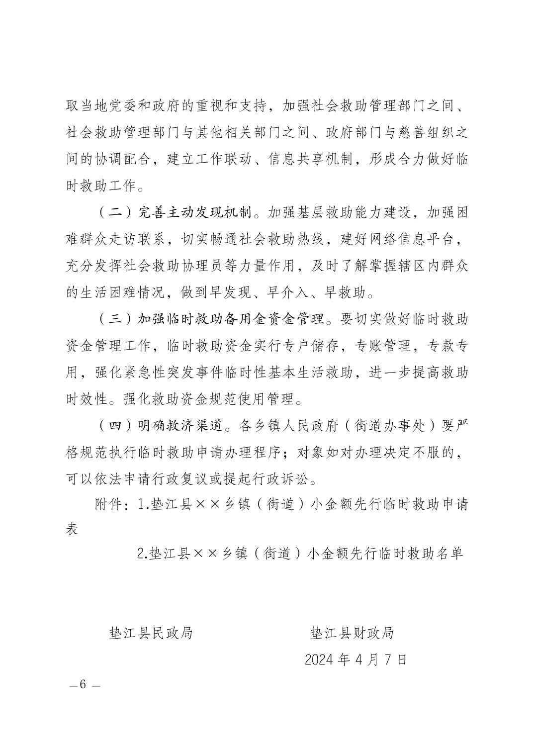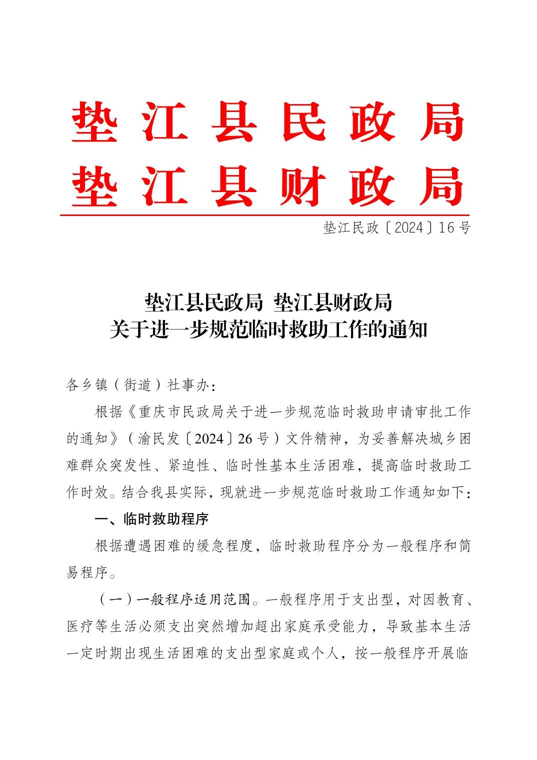 垫江民政〔2024〕16号 垫江县民政局 垫江县财政局 关于进一步规范临时救助工作的通知.docx垫江民政〔2024〕16号 垫江县民政局 垫江县财政局 关于进一步规范临时救助工作的通知.pdf