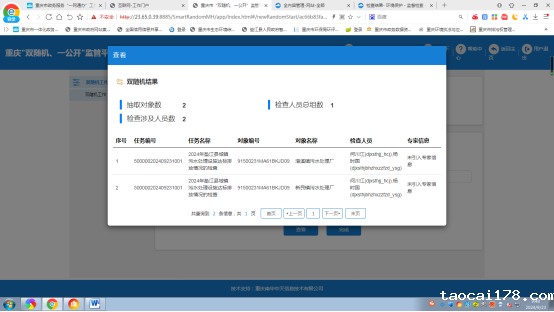 对本县污水处理厂进行抽查,抽取对象数2家,检查人员总组数1组,检查涉及人员数2人。