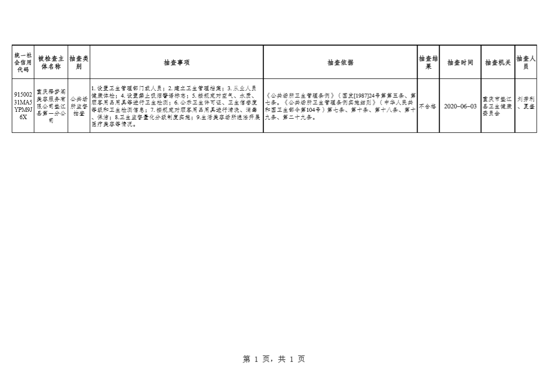 2020年公共场所随机监督抽查结果公示第五批(1户)