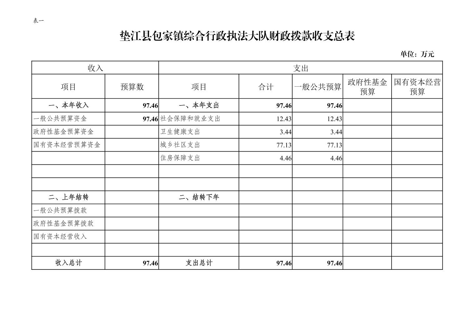附表:1.垫江县包家镇综合行政执法大队财政拨款收支总表