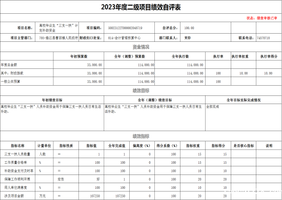 根据预算绩效管理要求,我单位对1个二级项目开展了绩效自评,涉及财政拨款项目支出资金11.40万元。本报告中主要列举以下1个二级项目:高校毕业生“三支一扶”计划补助资金。