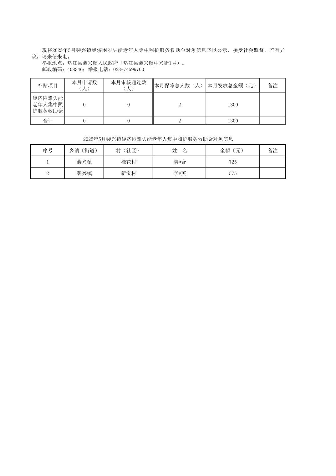 2025年5月裴兴镇经济困难失能老年人集中照护服务救助金对象信息